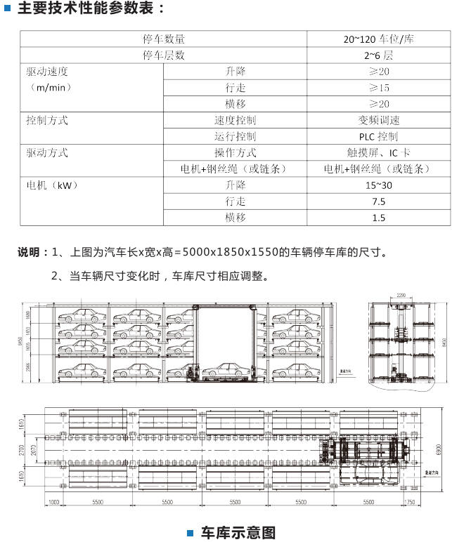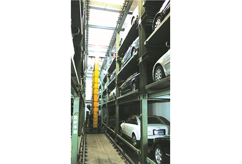 在兩側(cè)泊位的中央設(shè)有巷道堆垛機(jī),整個(gè)車(chē)庫(kù)的運(yùn)行均由堆垛機(jī)來(lái)完成。汽車(chē)入庫(kù)時(shí),汽車(chē)停在入庫(kù)臺(tái)上,堆垛機(jī)從出入庫(kù)臺(tái)上取走汽車(chē)后在巷道內(nèi)行走并提升,將汽車(chē)運(yùn)送到指定層的泊位旁,堆垛機(jī)上的存取機(jī)構(gòu)將汽車(chē)從堆垛機(jī)送入泊位;取車(chē)出庫(kù)過(guò)程與入庫(kù)過(guò)程相反。